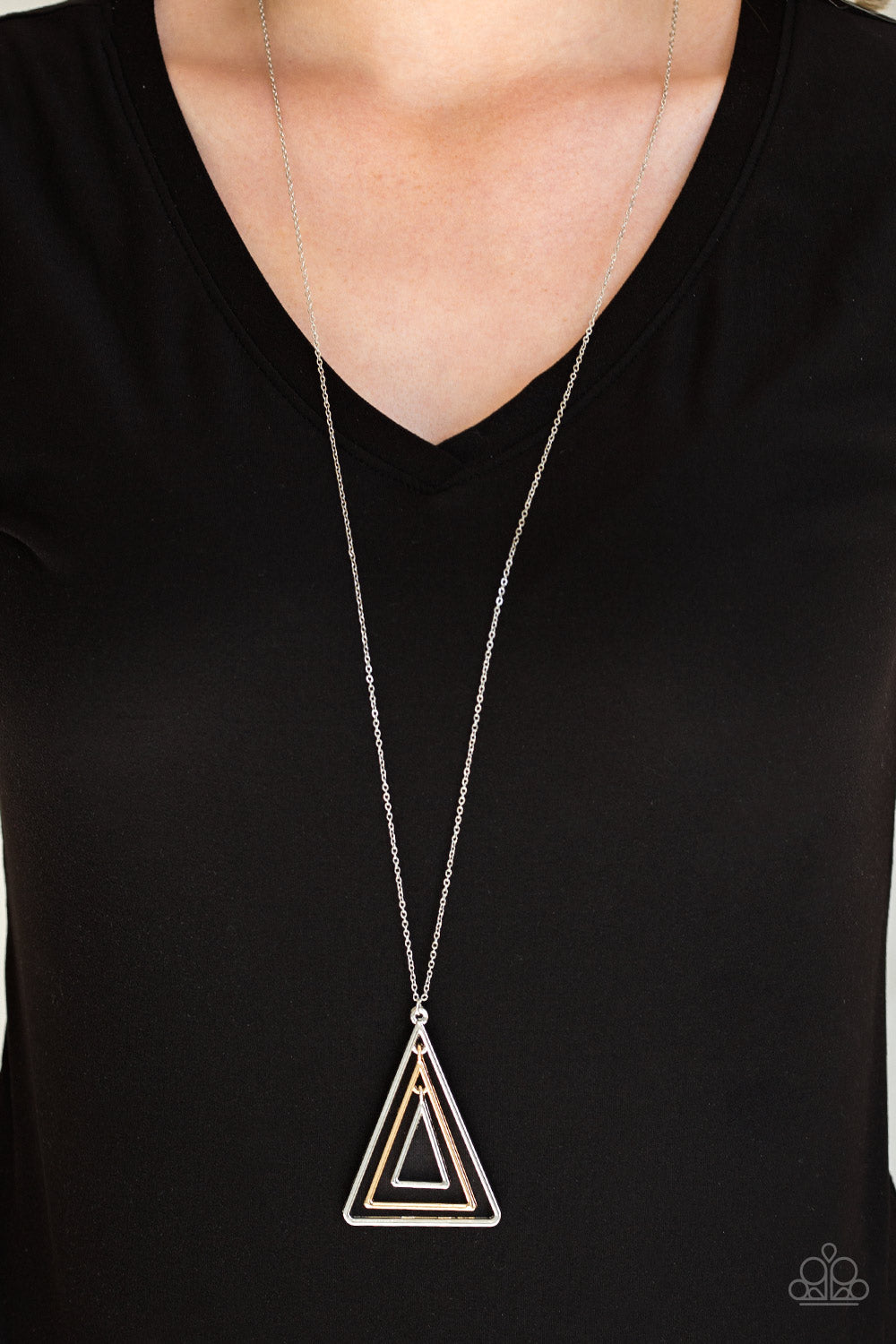 Infused with an elongated silver chain, glistening gold and silver triangular frames layer into a gorgeously stacked pendant for an edgy look. Features an adjustable clasp closure.